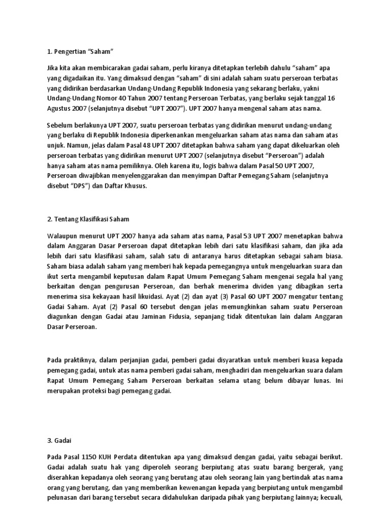 Artinya, ketentuan tersebut memberikan kemungkinan pemegang saham untuk mengagunkan saham yang ia miliki dengan gadai atau fidusia, namun anggaran dasar perseroan. Beberapa hal yang perlu diperhatikan/dipenuhi dalam menerima jaminan gadai saham antara lain: Bei pun mengimbau agar bijak dalam berinvestasi.