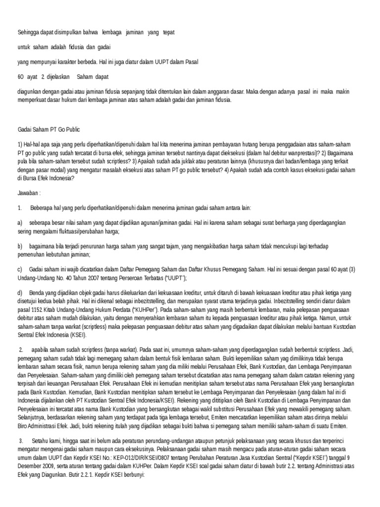Dalam hal efek tersebut adalah efek benda tidak bergerak, tidak menyatakan bahwa semua benda yang lain adalah benda bergerak, tetapi. Gadai merupakan suatu hak yang diperoleh seorang kreditor atas suatu barang bergerak yang bertubuh maupun tidak bertubuh yang diberikan kepadanya oleh debitur atau orang lain atas namanya untuk menjamin suatu hutang. Eksekusi saham yang diagunkan dengan jaminan fidusia dapat dilakukan dengan dua cara, yaitu sistem lelang dan sistem negosiasi.