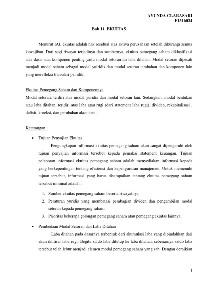 Apa yang dimaksud dengan ekuitas (equity)?secara umum, pengertian ekuitas adalah besarnya hak residual atau kepentingan pemilik entitas terhadap aset entitas tersebut setelah dikurangi semua kewajiban dalam neraca. Laba ditahan yang merupakan sisa laba setelah pembagian dividen c. Ekuitas pemegang saham (shareholder equity) adalah uang yang dapat dikaitkan dengan pemilik atau pemegang saham perusahaan.